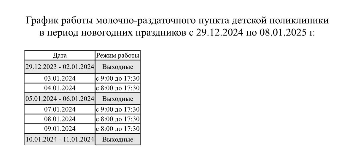 Дорогие друзья! Наступают новогодние праздники. В преддверии праздничных дней делимся с вами графиком работы молочно-раздаточного пункта детской поликлиники. 👇