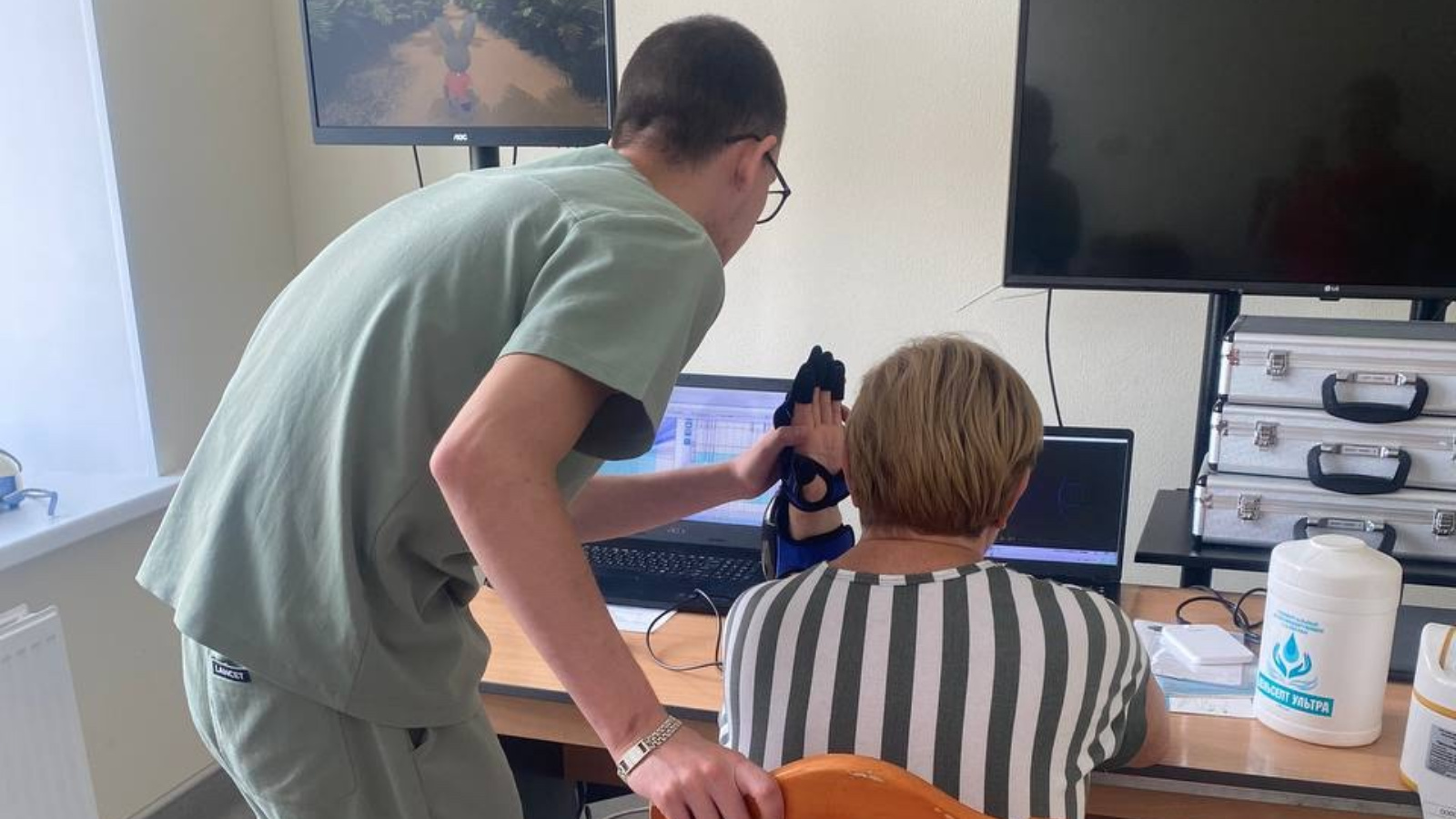 «Когда пациент выполняет упражнения на зеркальных тренажерах, то нормально двигает только здоровой рукой и ногой, а вторая при этом иногда остается практически неподвижной. Но при этом в зеркале он видит «свое отражение», которое синхронно двигается «целиком» (тренажер вместо больной стороны «показывает» в зеркальном отражении здоровую). У пациента возникает ощущение, что работают обе кисти или ноги. И мозг включается в этот «обман зрения», начиная подавать нервные импульсы. Поэтому не стоит отчаиваться и опускать руки. Главное - быстро диагностировать инсульт и провести реабилитацию» - отметил он.