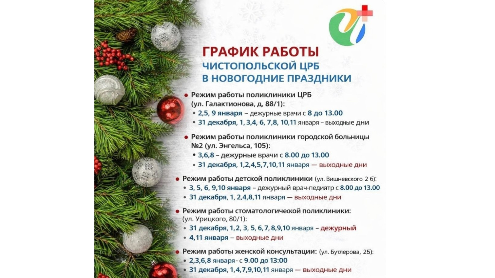 2, 5, 9 января – дежурные врачи с 8 до 13.00
